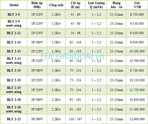 THÔNG SỐ KỸ THUẬT ĐẦU BƠM