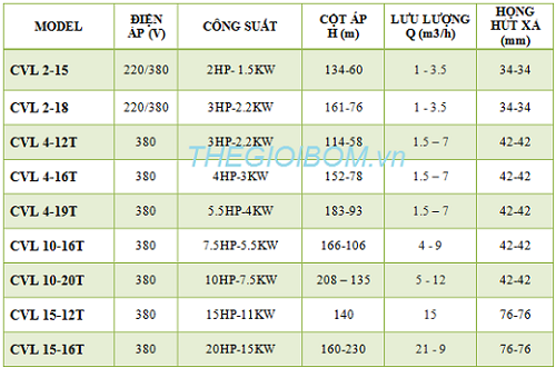 Đặt tính sản phẩm của Máy bơm trục đứng đa tầng cánh Ewara CVL Series